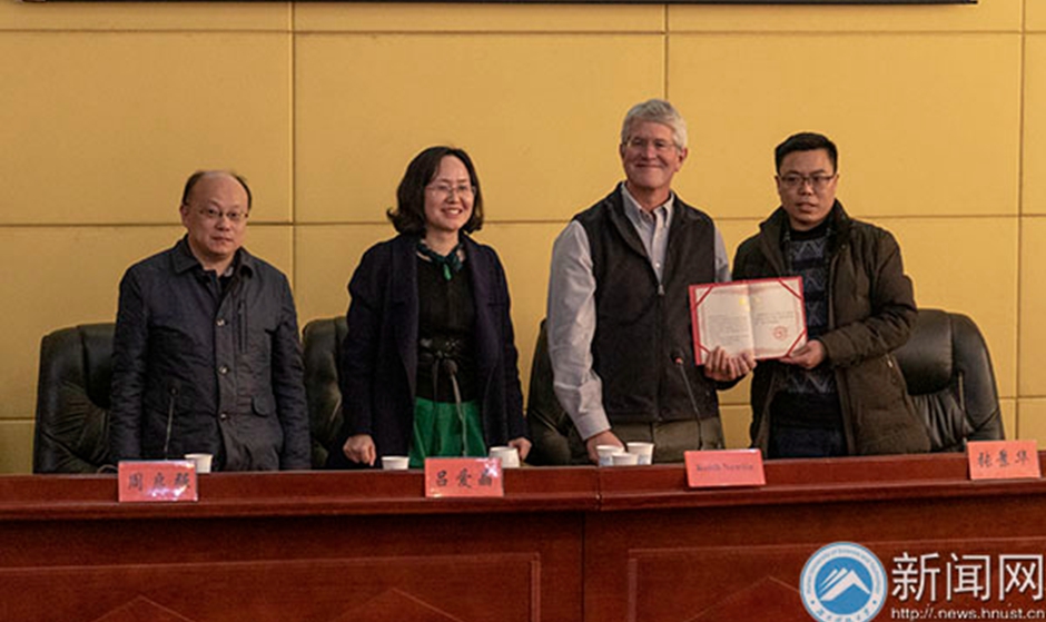 Mr. Zhang presented Professor Newlin with the engagement letter, extended sincere greetings and highly affirmed Professor Newlin's academic achievements and personality charm. Professor Newlin said in his speech that he would make greater contributions to HNUST’s teaching, scientific research and cultural exchanges between China and the West.